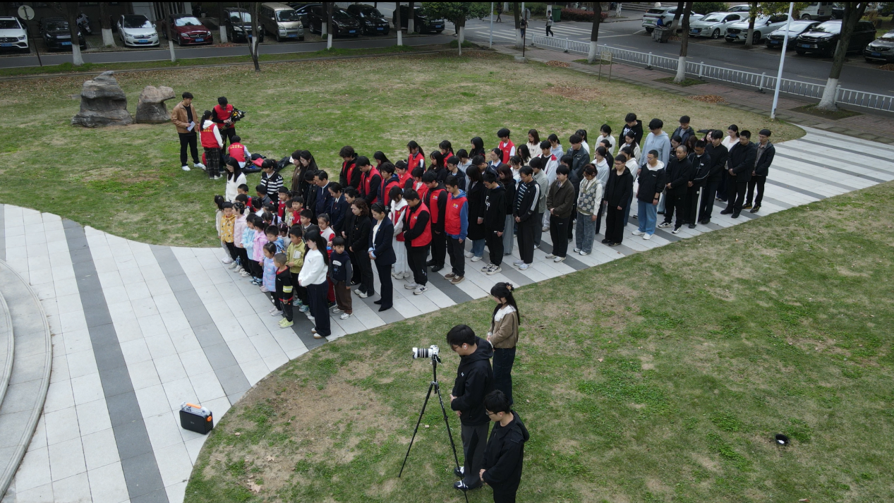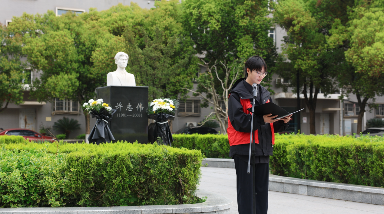 活动中,许志伟党员先锋队、许志伟志愿服务队学生代表为许志伟雕像敬献花篮。全体师生代表面向许志伟雕像肃穆伫立行默哀礼。
