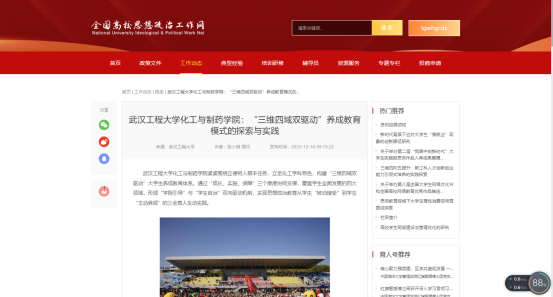 本网讯(通讯员 张小琪 周丹) 近日,学院学生思想政治工作典型经验《武汉工程大学化工与制药学院:“三维四域双驱动”养成教育模式的探索与实践》被教育部全国高校思想政治工作网宣传推广。近2年,学院学生工作经验先后4次在全国高校思想政治工作网宣传报道。此次获推的工作案例,系统介绍了学院立足一流学科建设开展大学生思想政治教育与行为养成教育的探索与实践。全文如下: