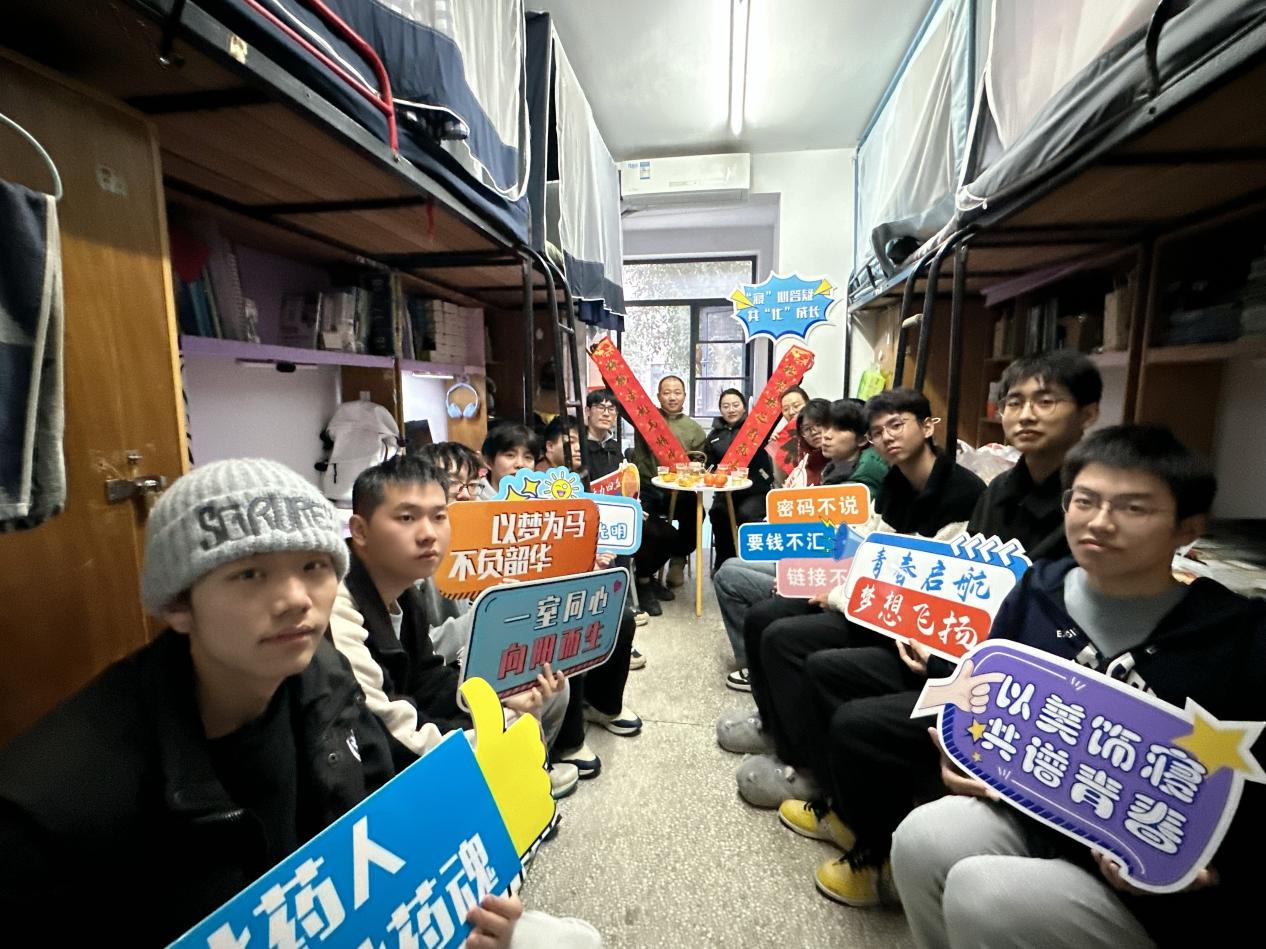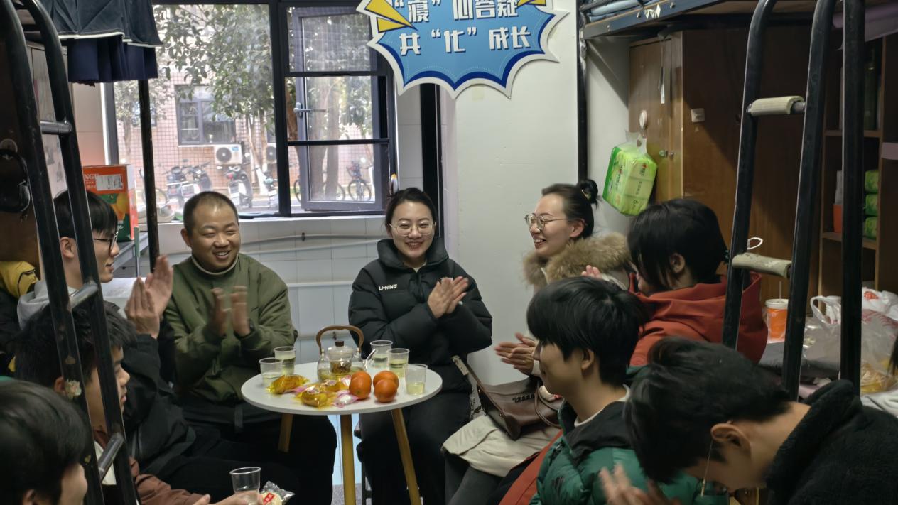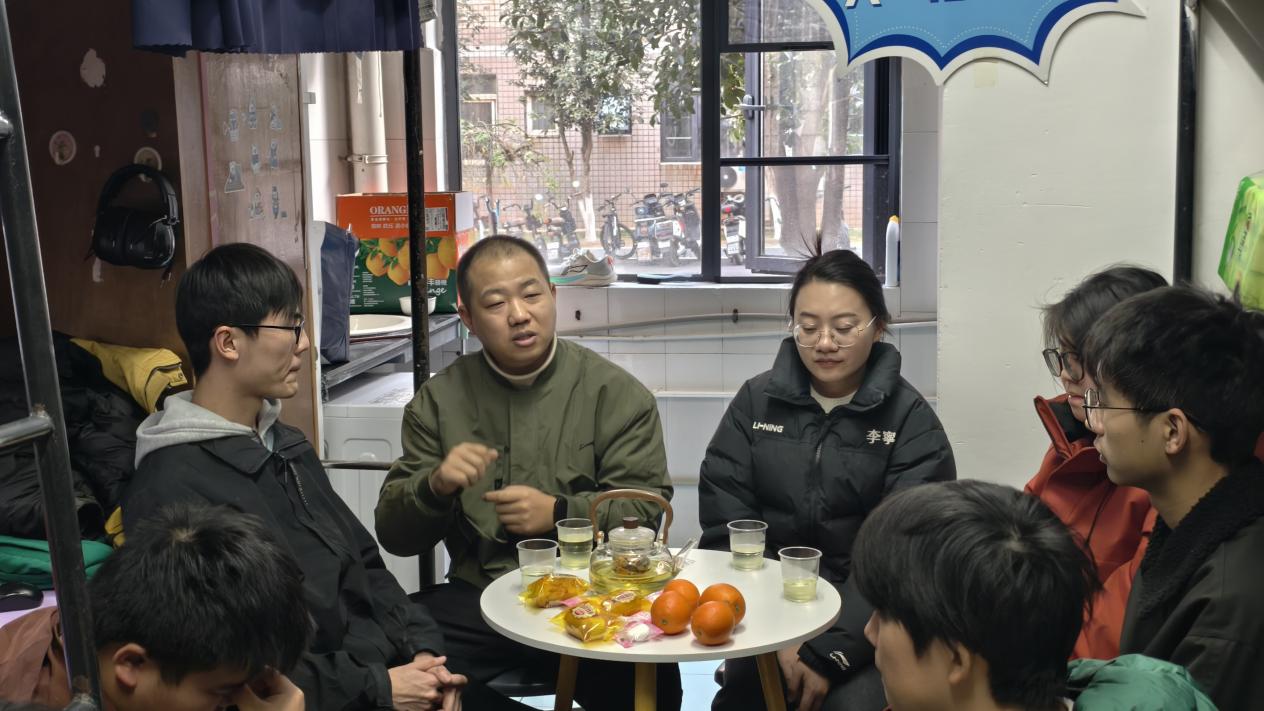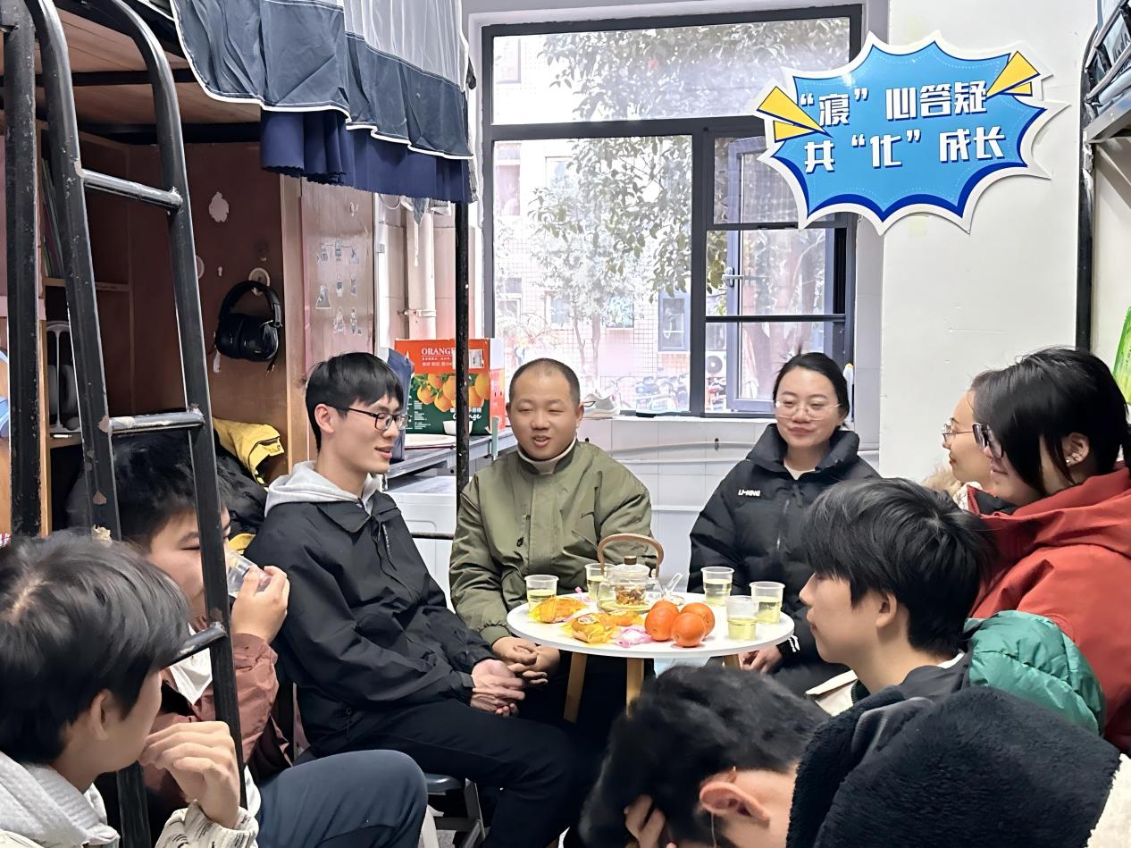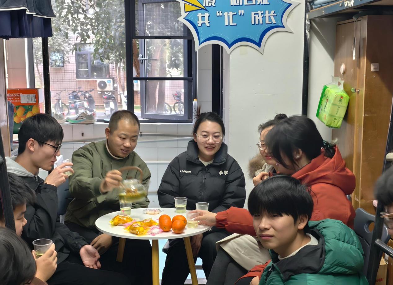 本网讯(通讯员 张列罡)1月9日,由化工与制药学院团委主办,本科化工第二党支部承办的“寝”心答疑,共“化”成长师生茶话会(第二期)活动在泰塑2-110宿舍顺利开展。学院辅导员,“化育启思”工作室成员张列罡、文静和刘悦薇,许志伟志愿服务队主负责人赖闽韬,2025级本科能源化学工程02班副班主任张诗雨邀请该班部分同学齐聚一堂、共话成长。活动由负责人张列罡主持。