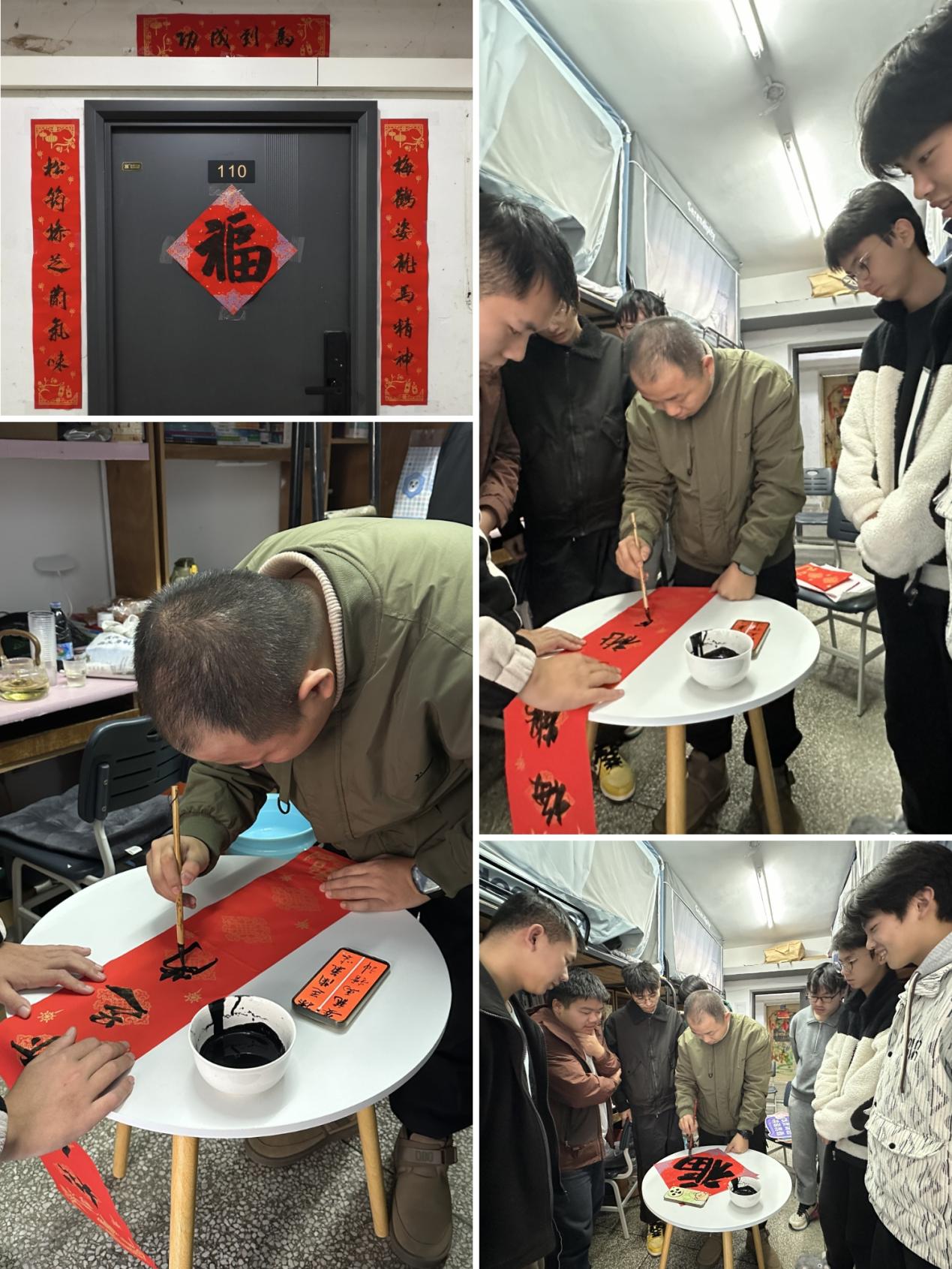 活动伊始,张列罡便带着满满心意做好了准备:考虑到冬日天干易上火,又恰逢期末备考压力较大,特意为泰塑2-110宿舍的同学们备上罗汉果菊花茶,助力大家清热润燥、舒缓身心;同时还精心挑选了各类小零食与新鲜水果,供大家自由品尝。另一边张列罡执笔挥毫,一幅幅饱含新春祝福的春联跃然纸上。同学们围站四周,宿舍内墨香袅袅、笑语阵阵,满溢着温馨祥和的浓厚年味。