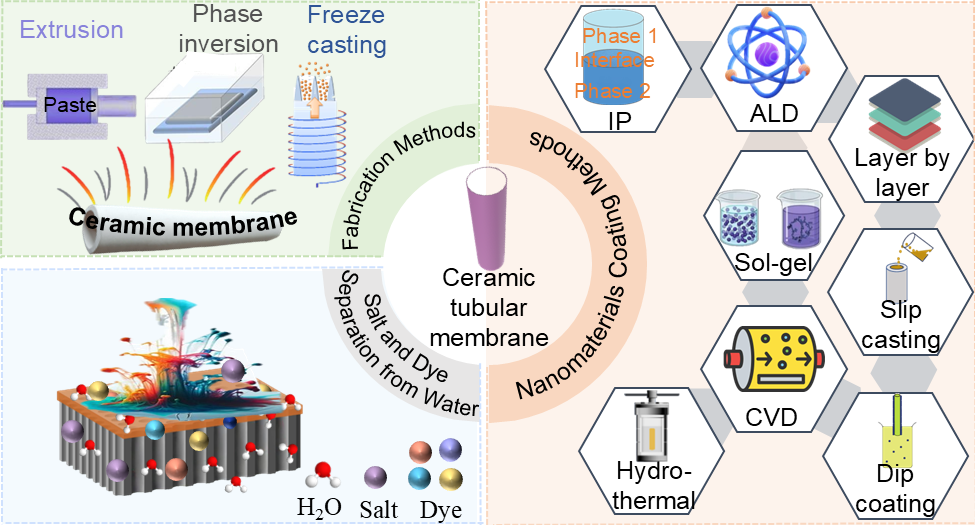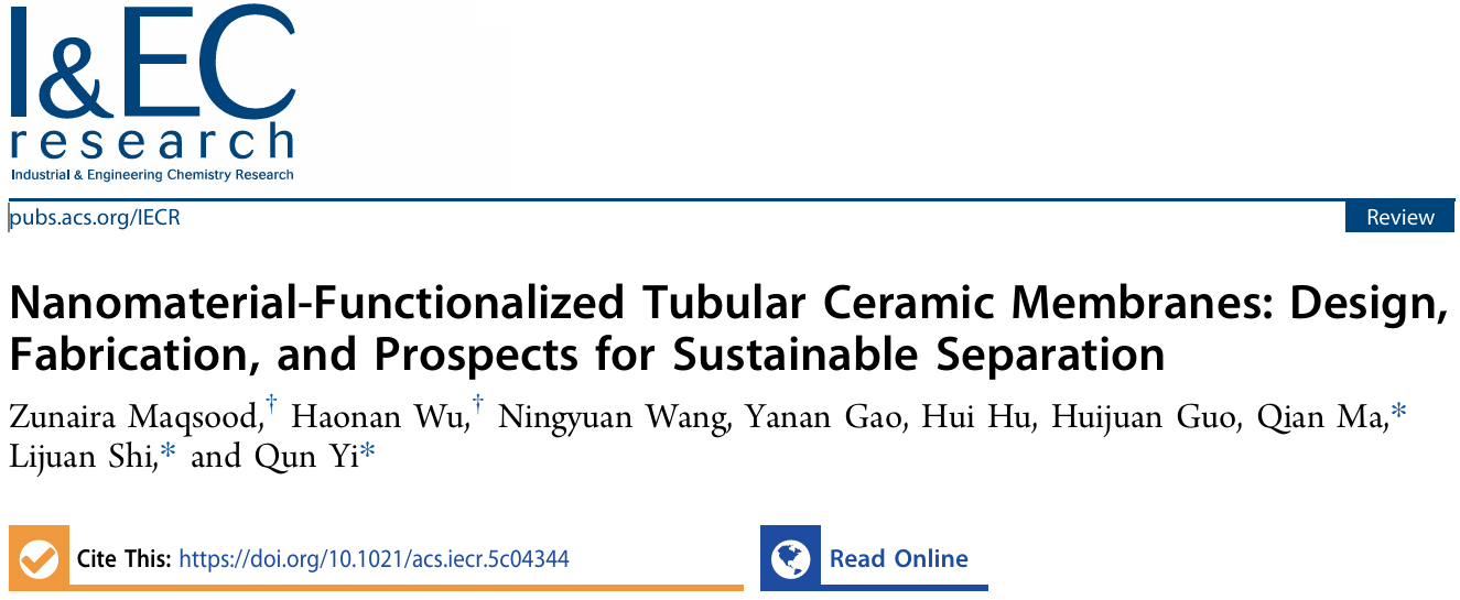 题为“Nanomaterial-Functionalized Tubular Ceramic Membranes: Design, Fabrication, and Prospects for Sustainable Separation” 的论文,聚焦于陶瓷膜管渗透性、选择性和抗污染性能等关键指标提升策略,并展望了可扩展、稳定且可持续的膜开发方向。纳米材料功能化管状陶瓷膜结合了陶瓷的稳定性与纳米材料的可定制性能,为可持续工业分离提供了可靠路径。本论文系统总结了该类膜的设计、制备策略、表面修饰技术及其分离性能,涵盖了MOFs、COFs、金属氧化物、石墨烯衍生物和MoS2等功能材料,以及挤出法、相转化法、冷冻铸造法、浸涂法、水热生长法和原子层沉积等制备方法。该论文发表于《Industrial & Engineering Chemistry Research》,该期刊是国际化学工程领域的顶级期刊,具有广泛的学术影响力。Zunaira Maqsood和武昊楠为共同第一作者,马倩博士、史利娟教授和易群教授为共同通讯作者。