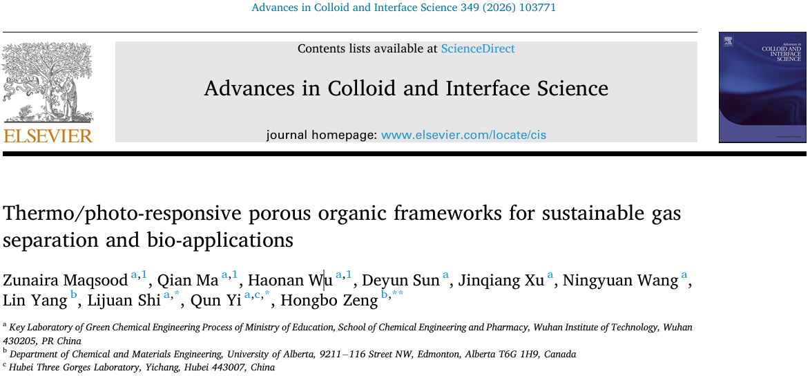 其中,题为“Thermo- and Photo-Responsive Porous Organic Frameworks for Sustainable Gas Separation and Biomedical Applications”的论文,系统总结凝练了热/光响应POFs的设计、机制及应用,指出了其在可持续气体分离与先进生物治疗中的潜力,并强调未来通过深入理解结构-响应关系、结合原位表征与计算建模,有望推动其在智能材料技术中的实际应用。该文发表于《Advances in Colloid and Interface Science》(影响因子19.3),该期刊是胶体与界面科学领域最具影响力的学术期刊之一,长期位列中科院化学大类1区,具有极高的学术声誉和影响力。武汉工程大学为该论文第一署名单位,博士研究生Zunaira Maqsood、马倩和武昊楠为共同第一作者,史利娟教授、易群教授及加拿大阿尔伯塔大学曾宏波教授为共同通讯作者。